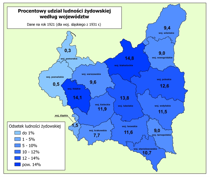 Procentowy udział ludności żydowskiej według województw II Rzeczypospolitej - dane z 1921 r. (dla woj. śląskiego z 1931 r.), red. mapy: Jacek Cieślewicz.