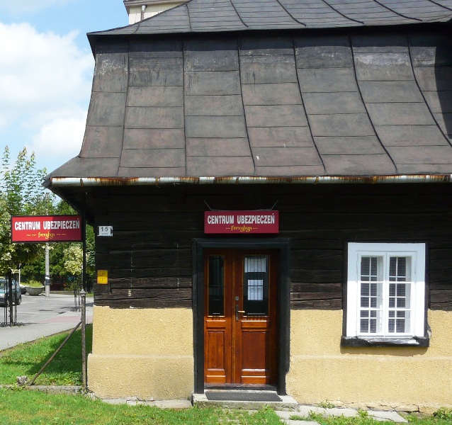 fotografia budynku w centrum Wilamowic z dwujęzyczną reklamą Centrum ubezpieczeń /