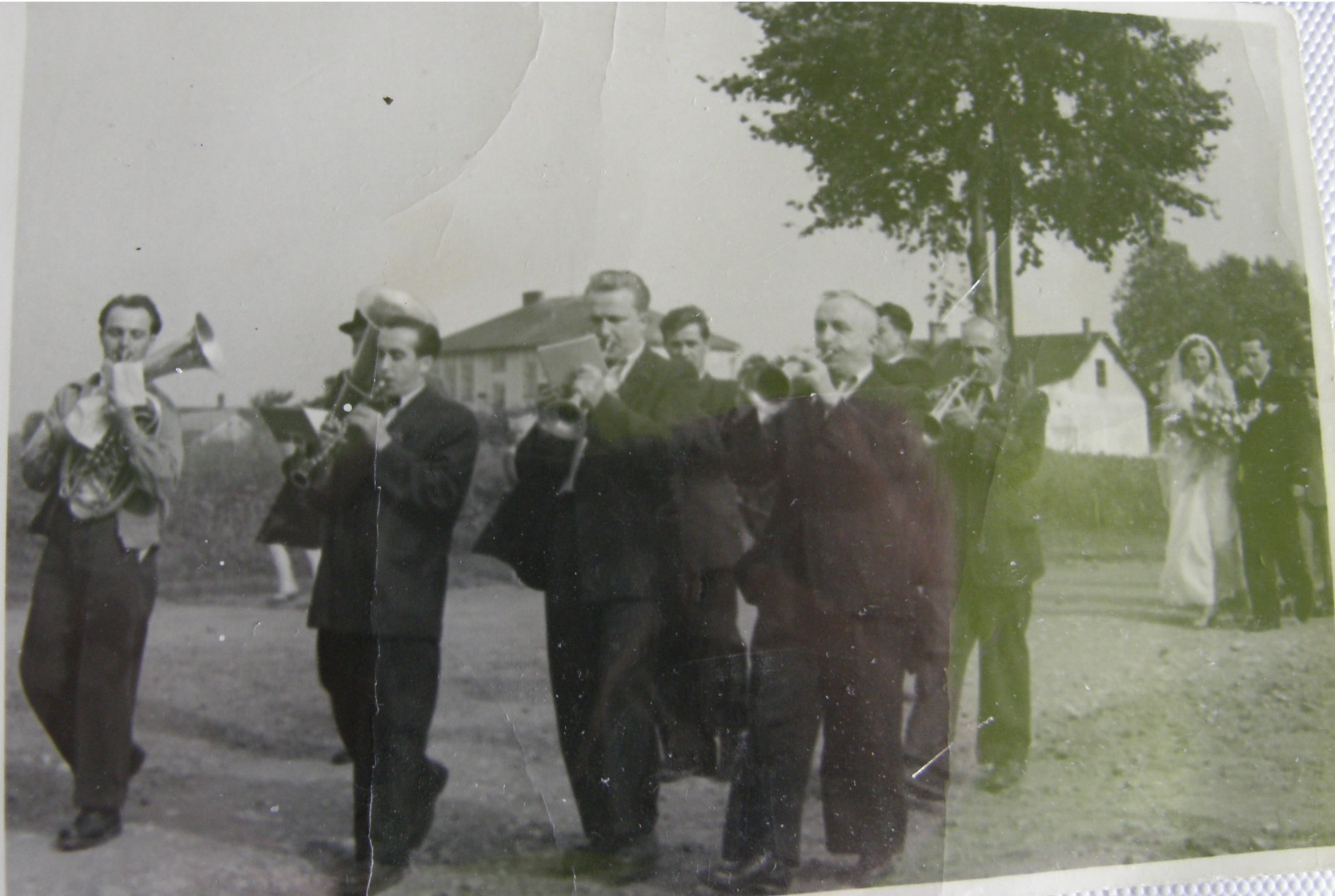 Zdjęcie pochodu weselnego przez wieś, o którym wspomina informator